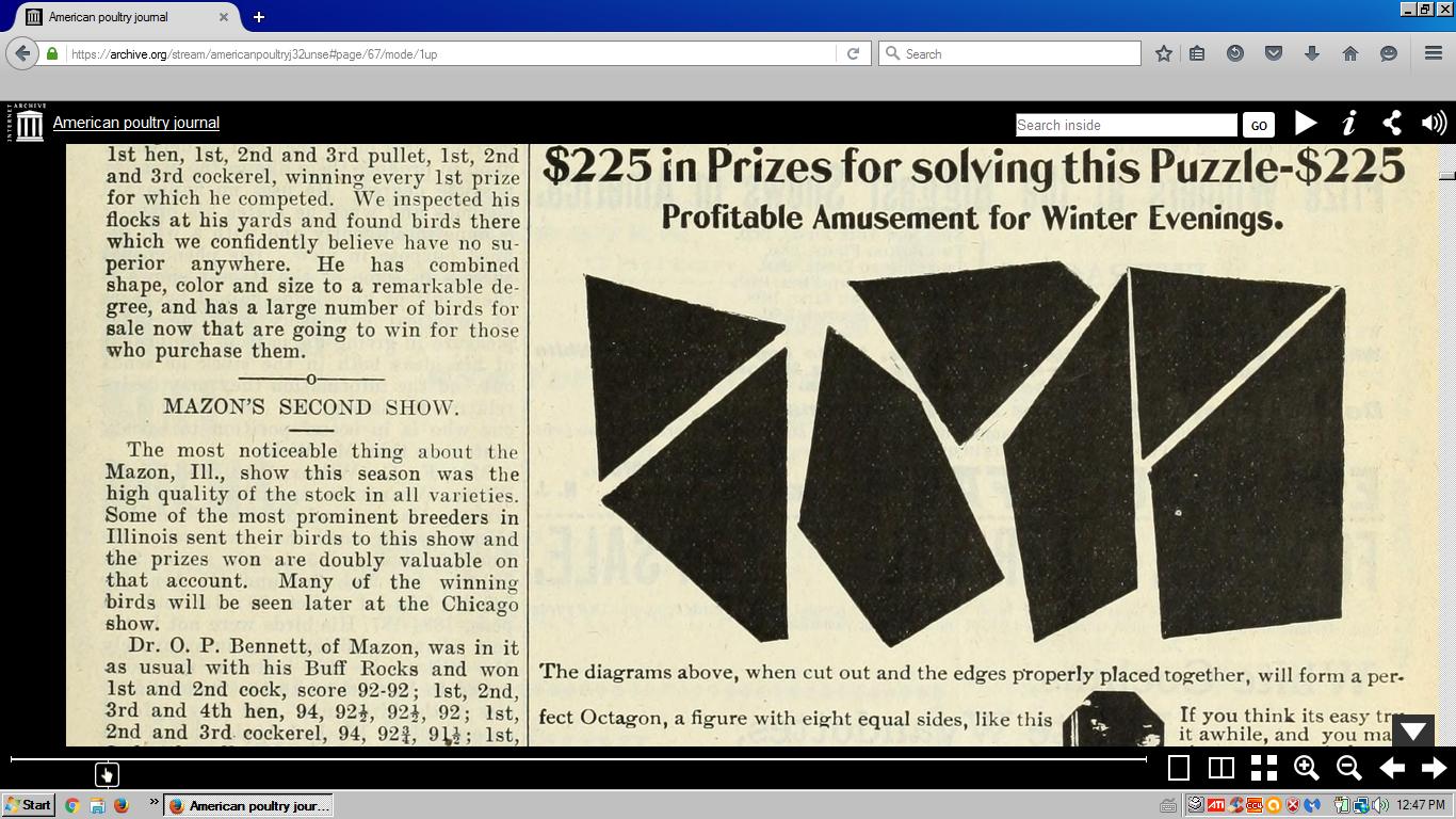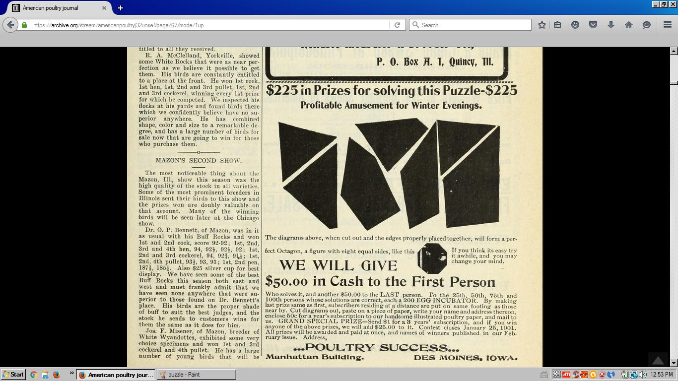 Here's one, if you got it right you could win $$ (in 1901). I like reading the old poultry journals. I posted a bigger picture that can be printed off if ya gots ta know........... I just used the Blonde method and traced the outlines from my computer screen. Yes they do make a perfect octagon! I'll post the solution once I get a photo.