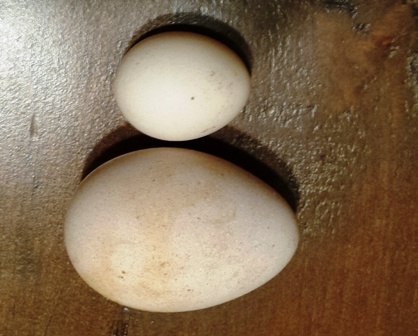 Just kidding!!! The bottom egg is my first turkey eggs 77 grams, the top egg is a turkey "fart". I found this in my turkey pen today as well, 20 grams. Maybe I can make some quail sized turkeys.
