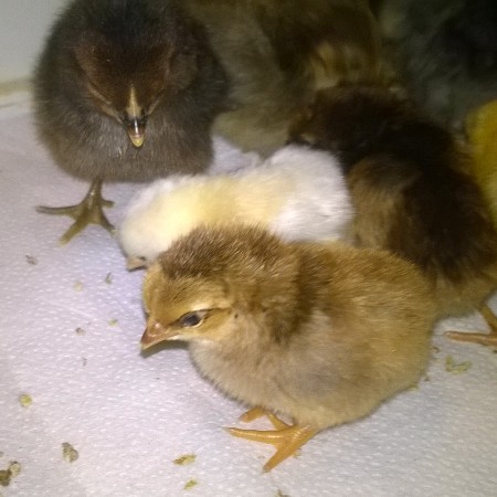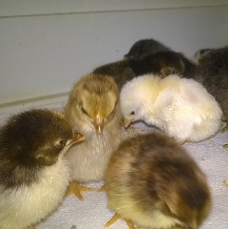 As promised, here are some pics from our last hatch. There are 3 Seramas from an earlier hatch, but they are still smaller than the day old Isbar and EE. Only 4 or 5 more hatches to go until later this year. Need to build another grow out area!.