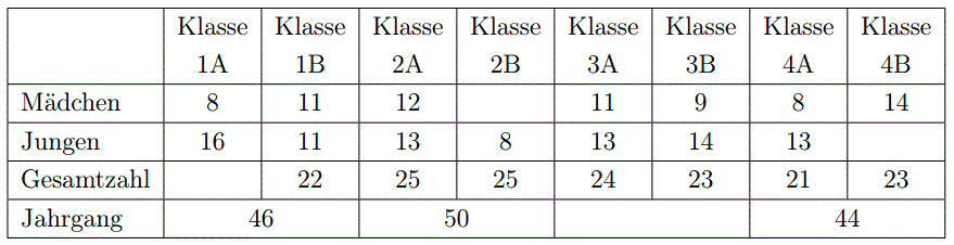 Klasse : Class => Class 1A and Class 1B are the two sections of that year's September intake. Combine the numbers to get to the total numbers