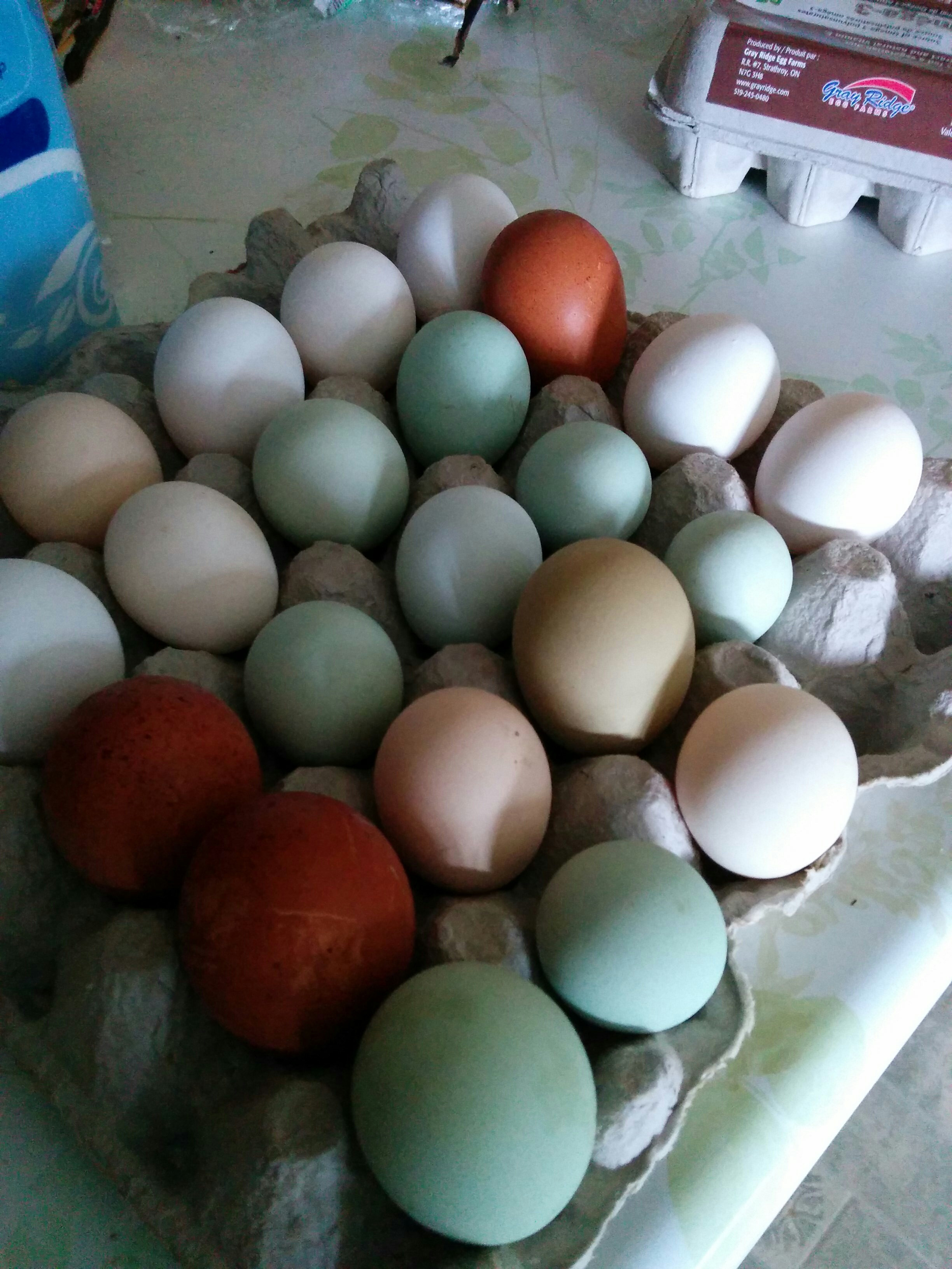 Just a days collection of eggs ,bantam and standard. Ameraucana, leghorns, olive egger, marans, polish, orpinton, Wyandotte and Cornish, just love the different colours.
