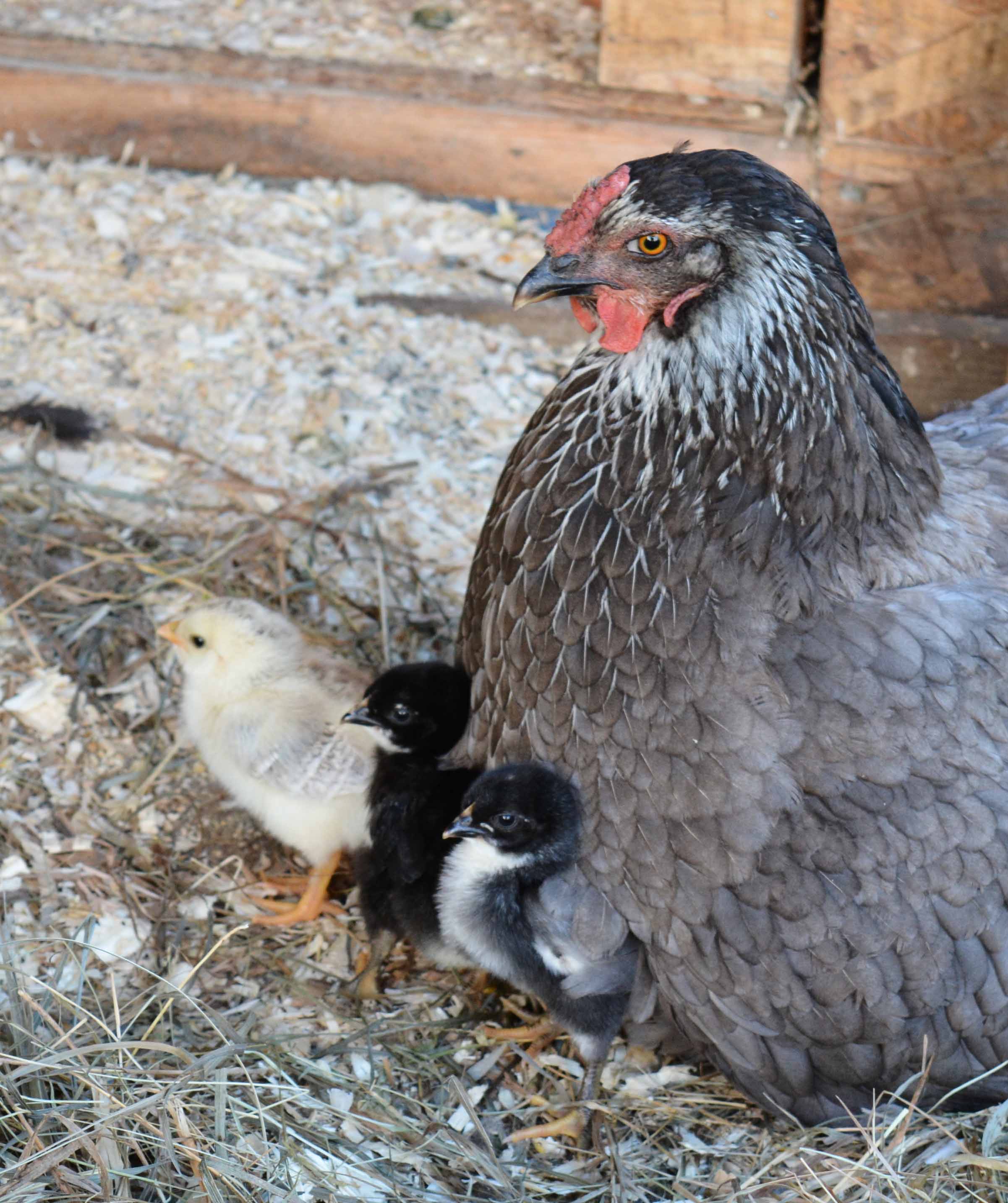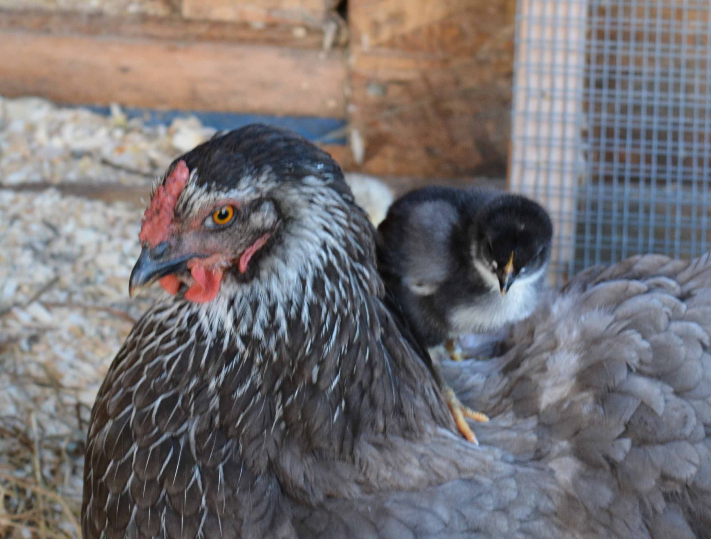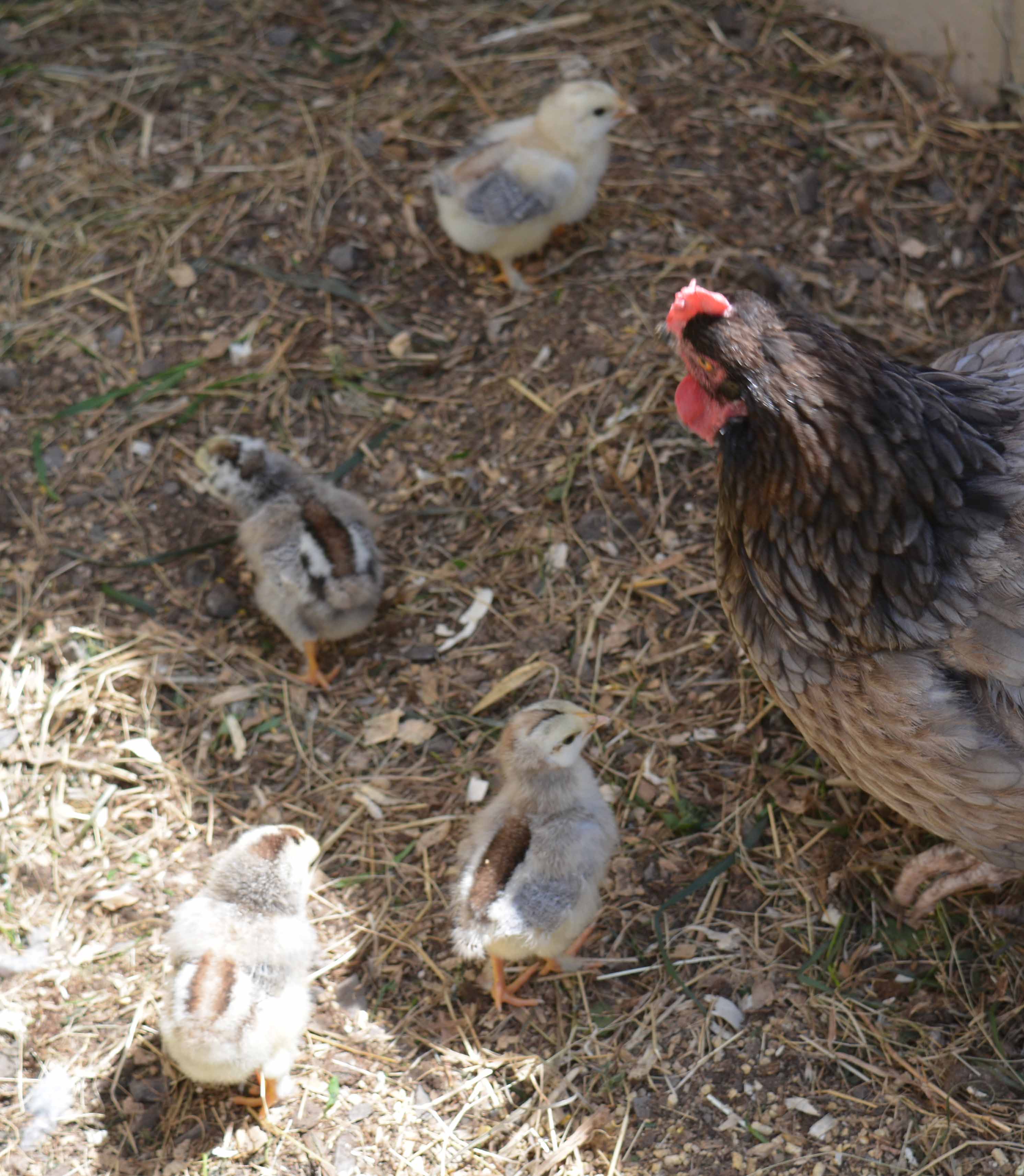 The 2 dark downed chicks are Nearlys "grandaughters"! NJs sister at Kyles with a partridge chantecler rooster!