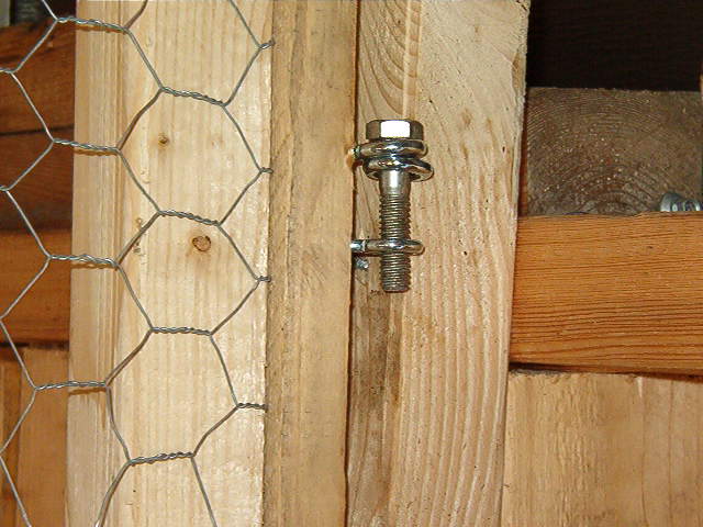 I haven't thought to use his method to fabricate a hinge, but its clever...however i used this idea horizontally to tie together the numerous panels of the run for the girls...one eye bolt on each panel, a hex bolt thru the two and a nut...allows for uneven turf and can pull the panels together nicely...