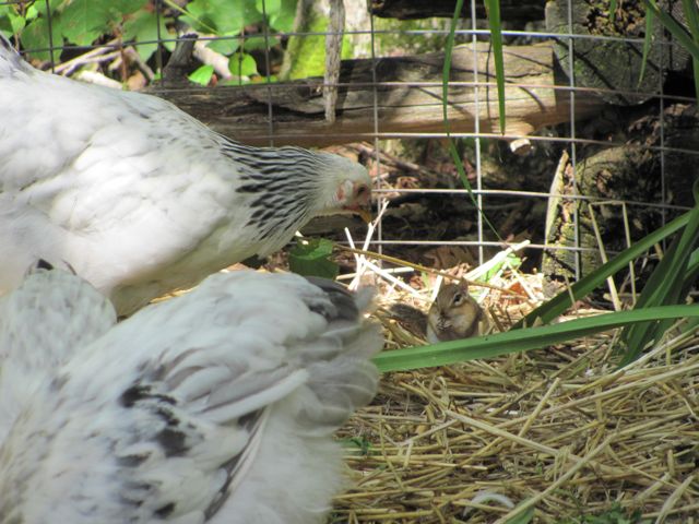 another unexpected bonus, I tip it ocasionally so it doesn't go moldy on the bottom and there are worms hanging out of the other side, perfect protein and veg combo There was some excitement in the corner of the run so went to look, prety brazen chipmunk was checking out the chicken goodies until one of the large cockerels spotted him and tried to get a closer look and the chase was on, pretty funny to watch