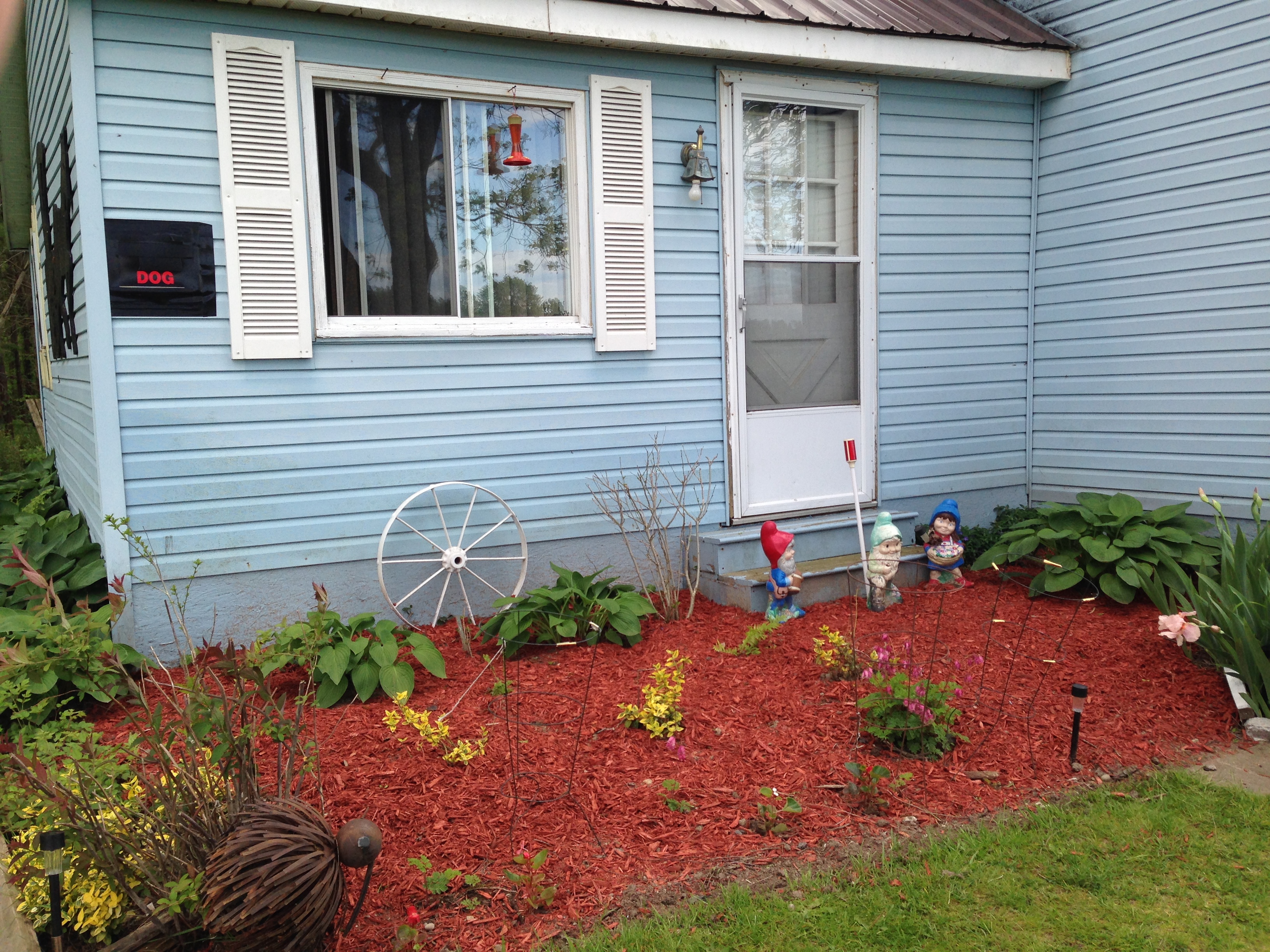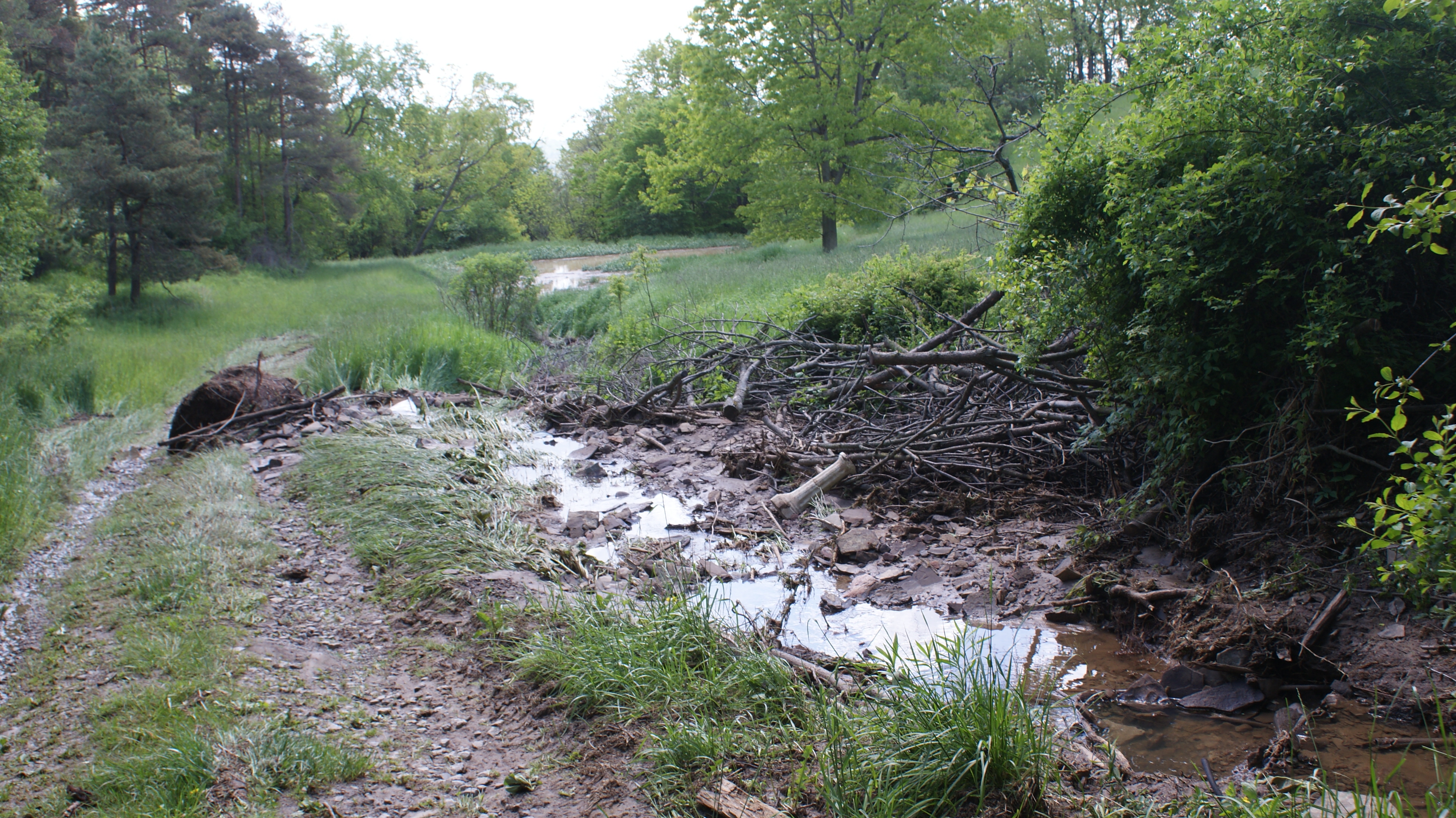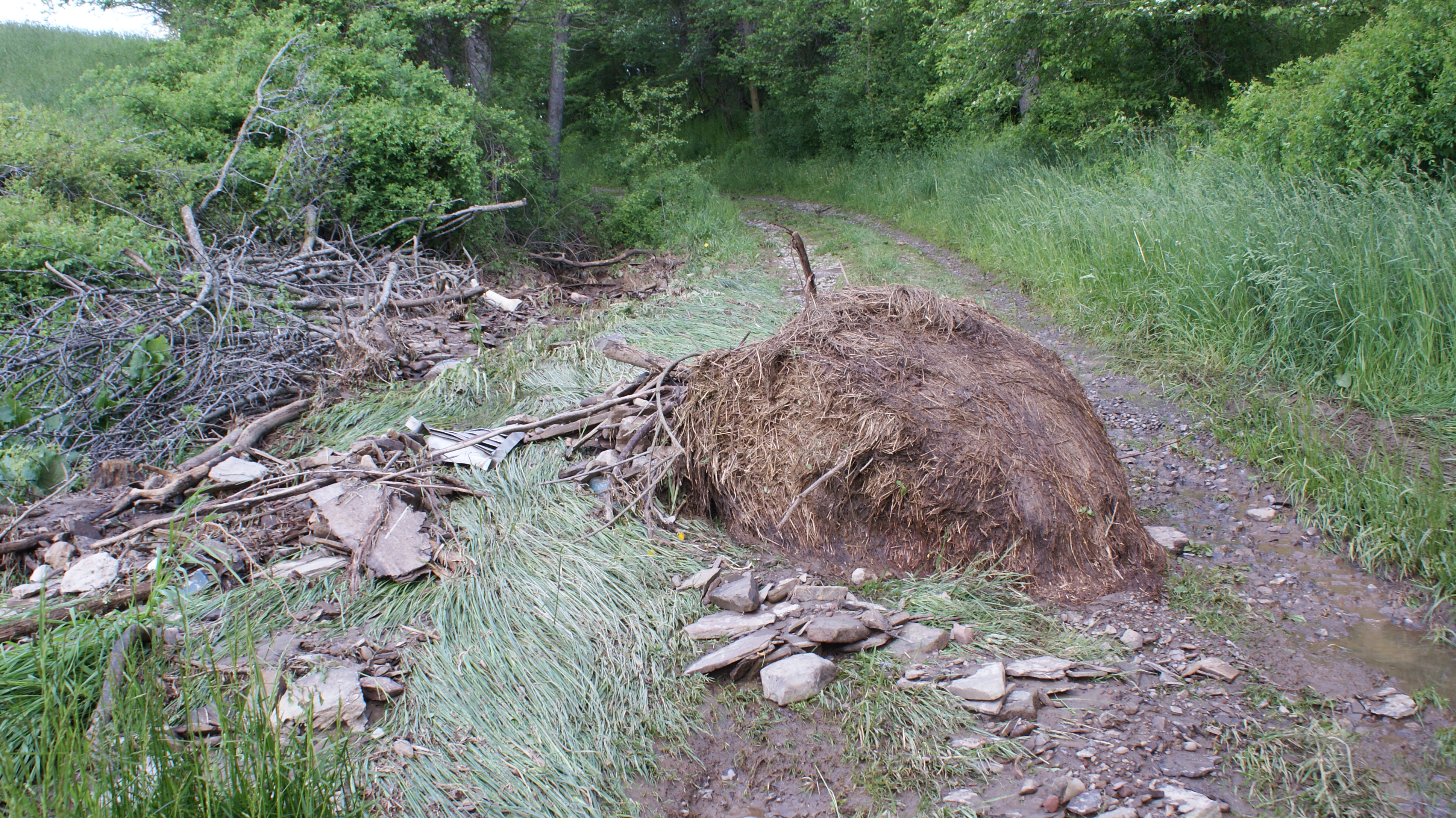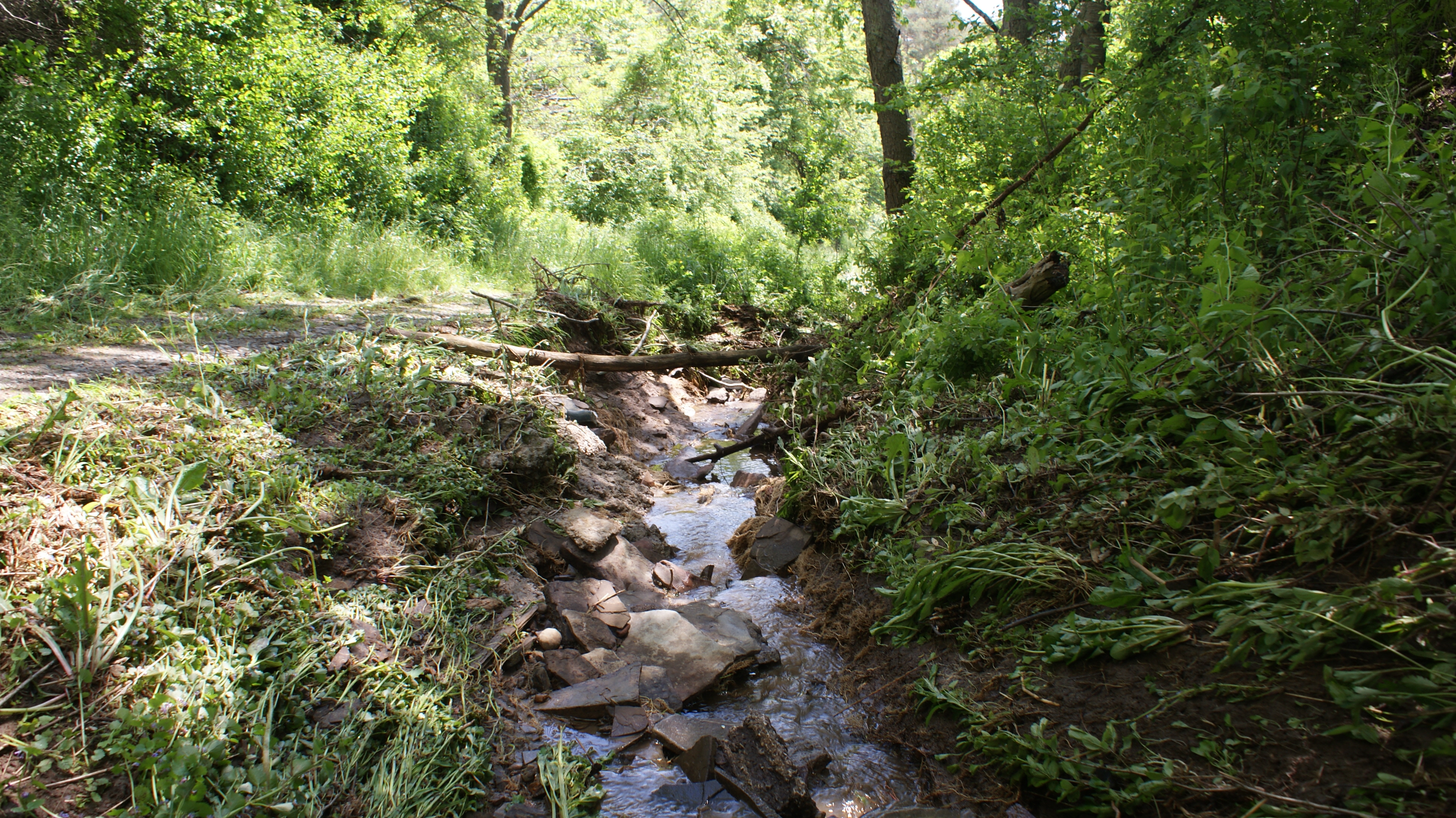 The night before, or two days before, we had a torrential downpour thunderstorm in the night. We got almost an inch and a half in short time. Heres what happened with that storm. Haven't been back to the BACK bush part, to the waterfalls, or creek, but I imagine theres some damage.