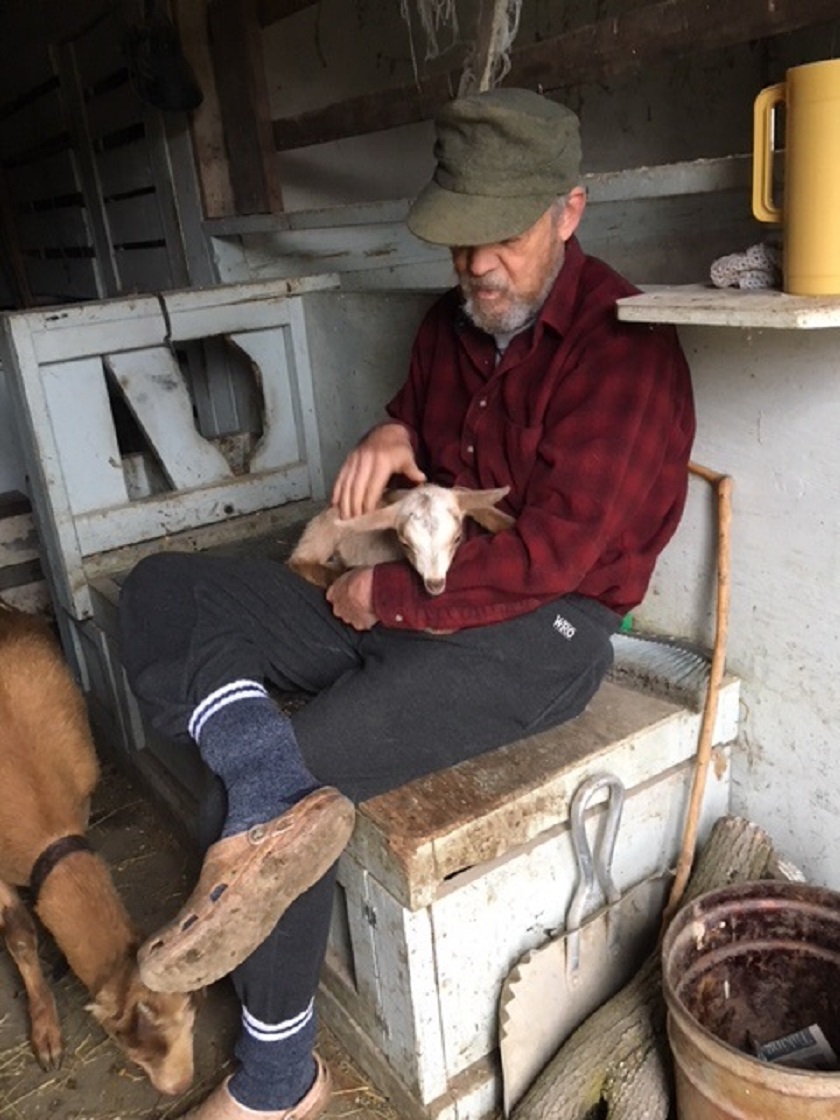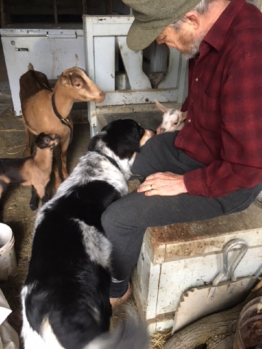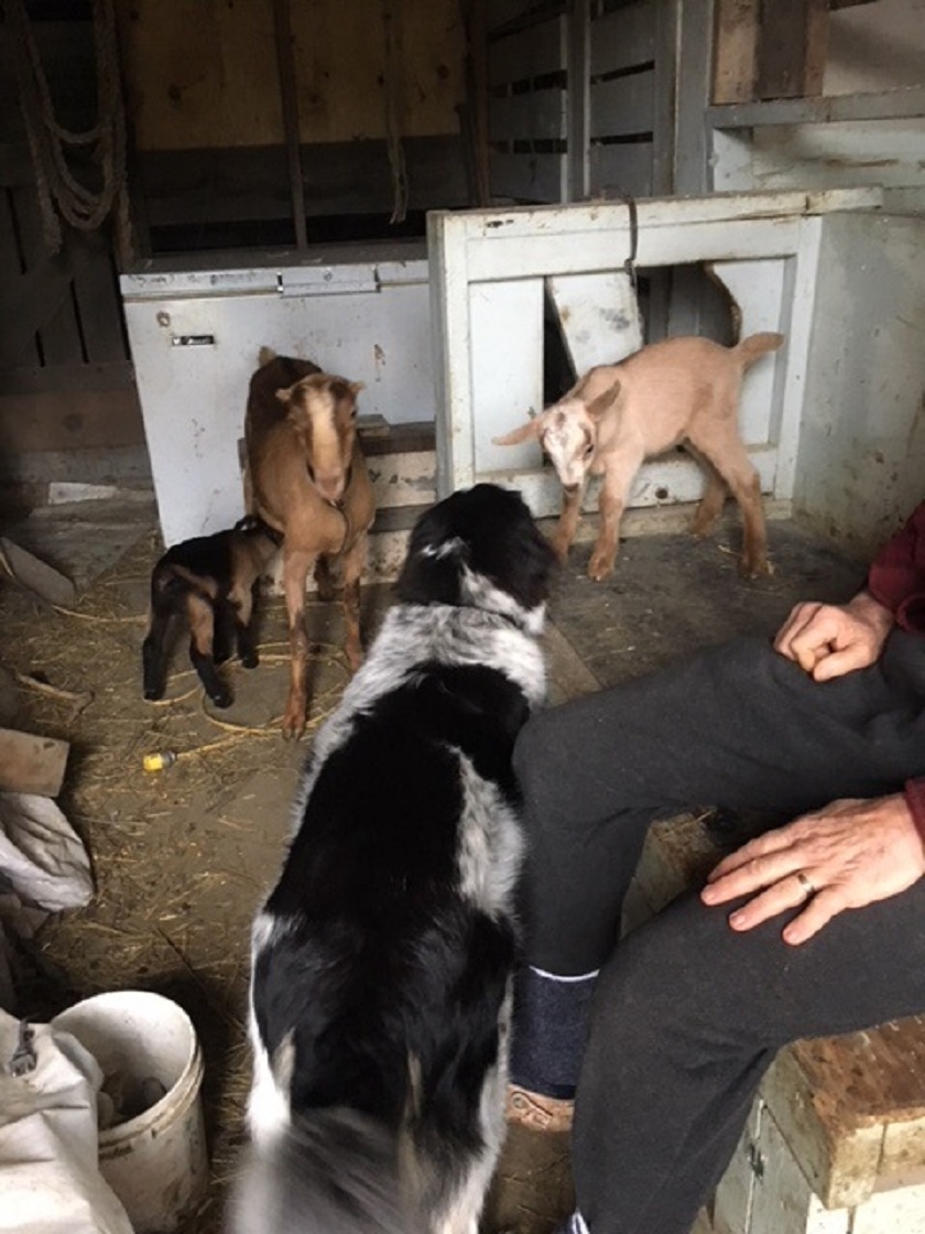 Dulcinaya is a yearling, and is a good mom. I had been giving her her grain in the milkstand all winter and playing with her bag. Milked her the first time and she never flinched. I sure like doing things this way. All a progression not an event. And Dulcinaya is going to be a bood milker. The twins with her 24 hrs a day, and I am emptying her morning and evening, close to a Litre each time, and the babies are getting lots.