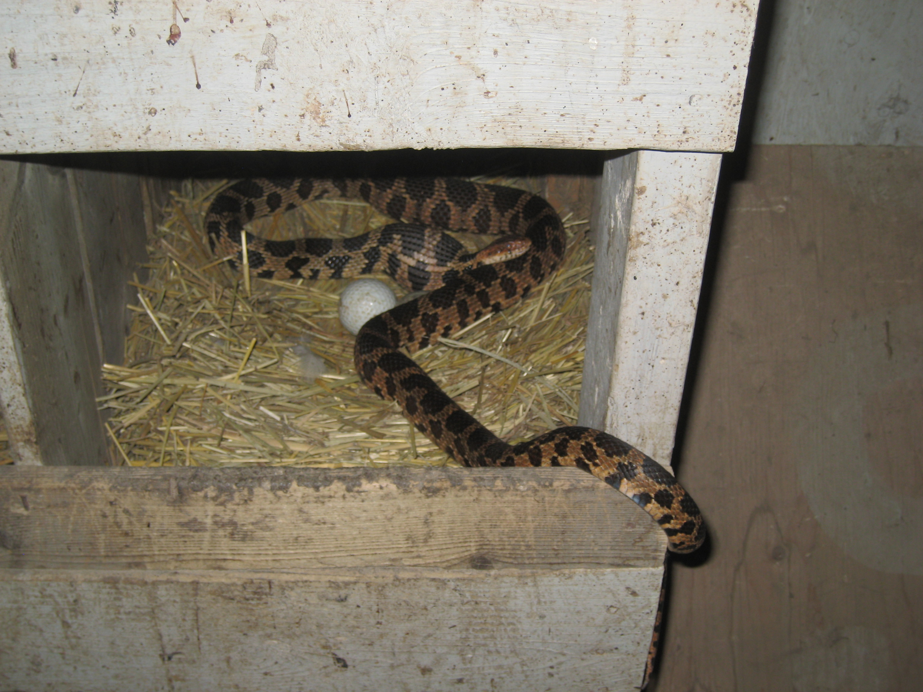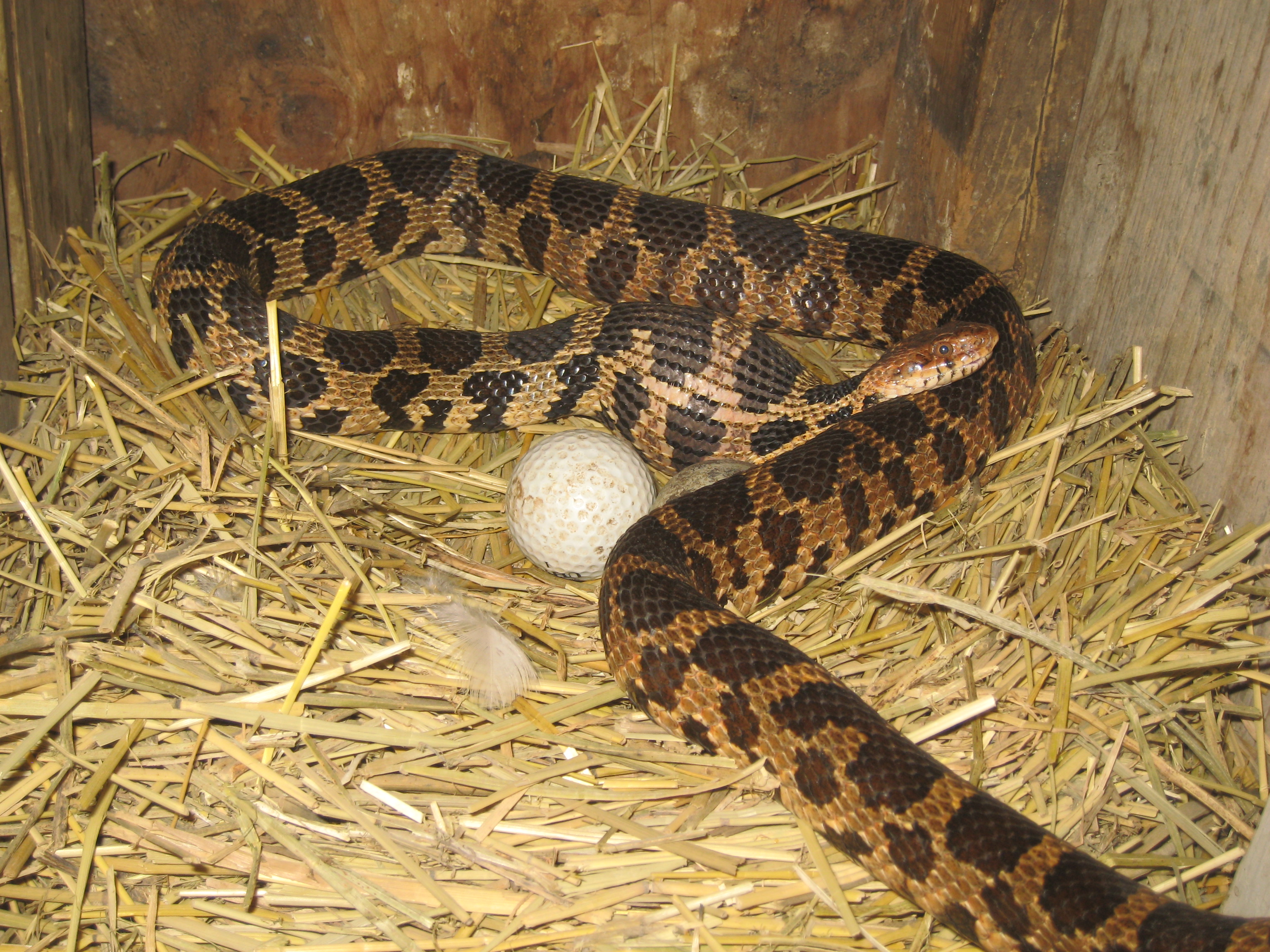 Went to get eggs and found this fella. Took and put him over the lake bank. Fox snake, endangered species but doing well around here. Every summer I have something happen with them. Today just egg, no chicks or setting hen which has happened before. Constricted the hen and killed her a couple years ago. I think she tried to defend her nest. I have found shed skins in the barn too. But if its a few eggs a year, so be it. Havent had to go to war yet, and I don't want to.