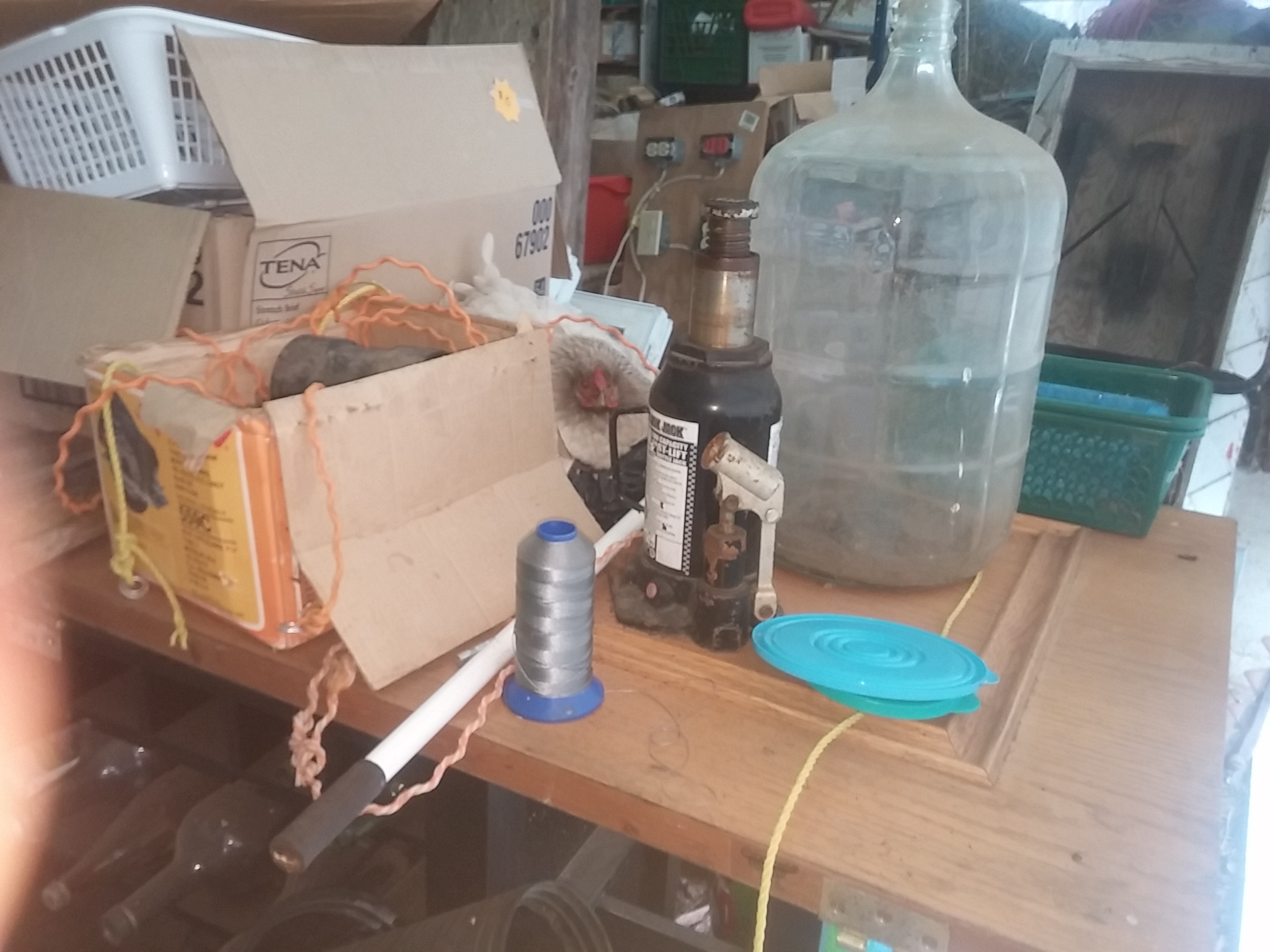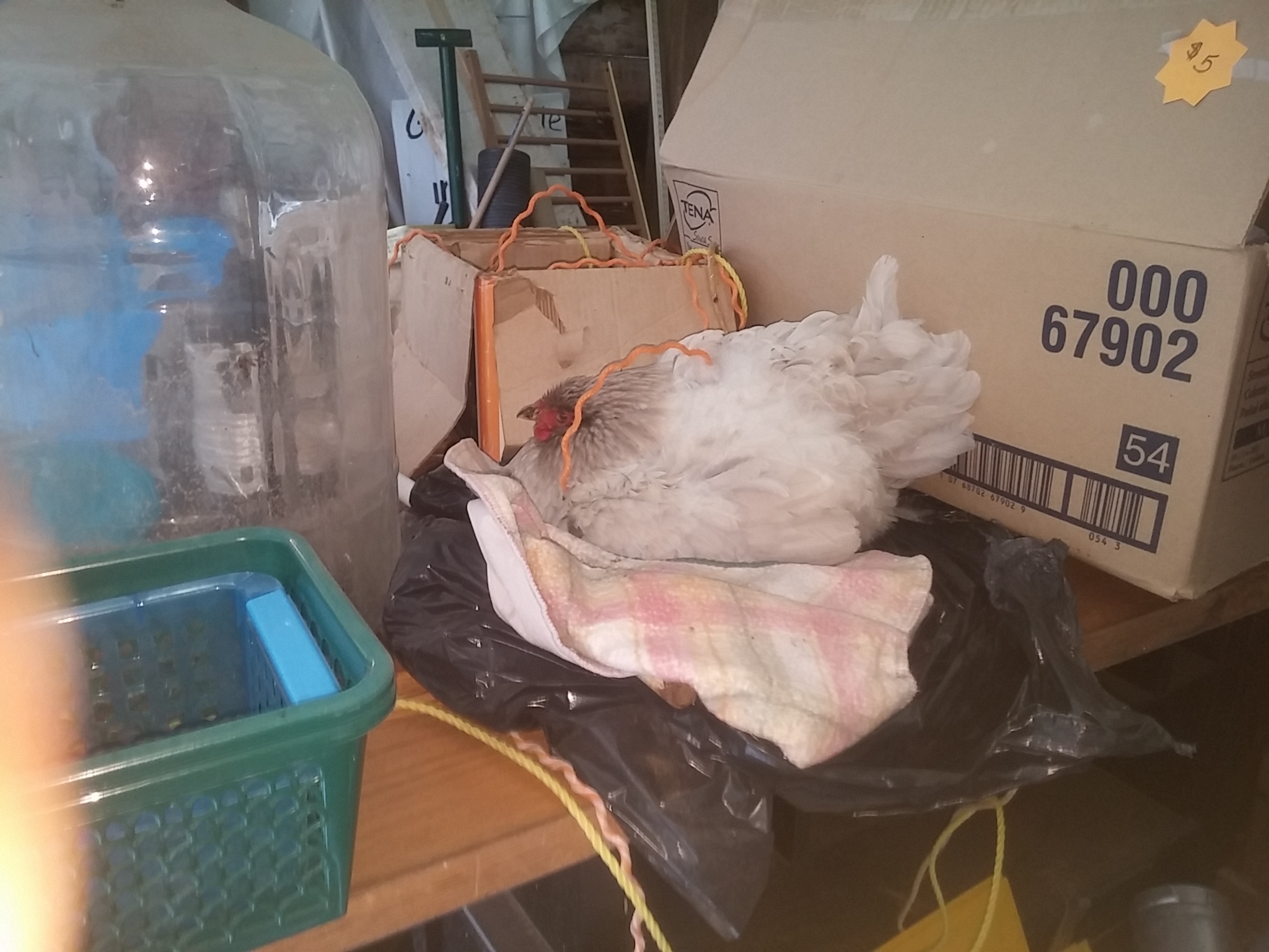 @Ontario Chick , you remember the light blue girl I got from you via KB? Well, do you know what your "Sensible, no-nonsense" Wyandotte is doing? She's broody, on a dozen eggs. But not in a coop, nooooo. She's in the very back of the cover-all, on top of stacked furniture and bric-a-brac. Her nest is on a door that was set on a cabinet, three feet in the air. I'm going to have to move her, obviously, but in the meantime I guess she at least has a nice view. When the back door is open, she can see my vegetable garden field and pasture. She's been stuck tight three days and nights now. No word on what she thinks will happen when babies hatch and start to explore, I guess safety considerations were secondary to the view