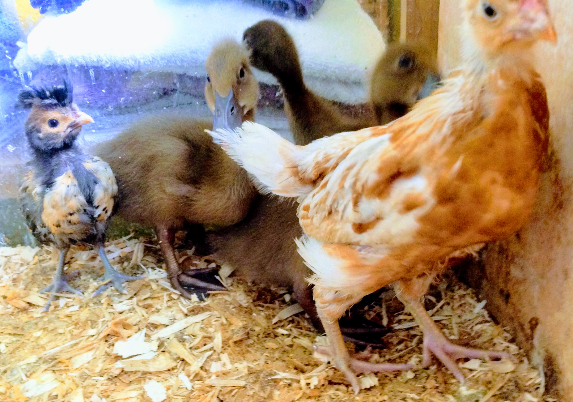 I just checked on them, and they are all asleep at the same end of the brooder, the ducklings in one pile and the chick and rooster snuggled together just an inch or two away, and all is well. Hopefully raising them together will help them get along when the two groups meet.