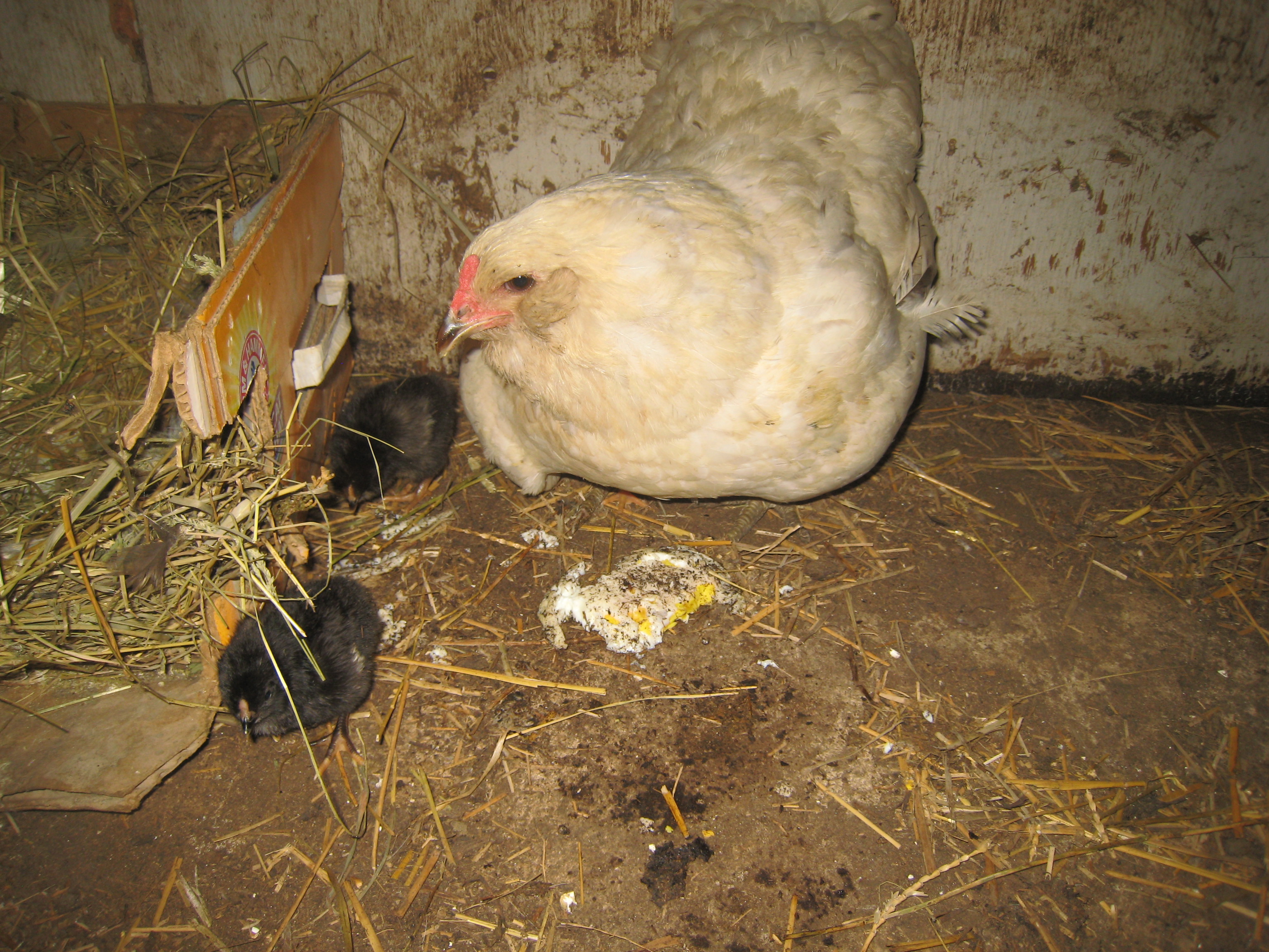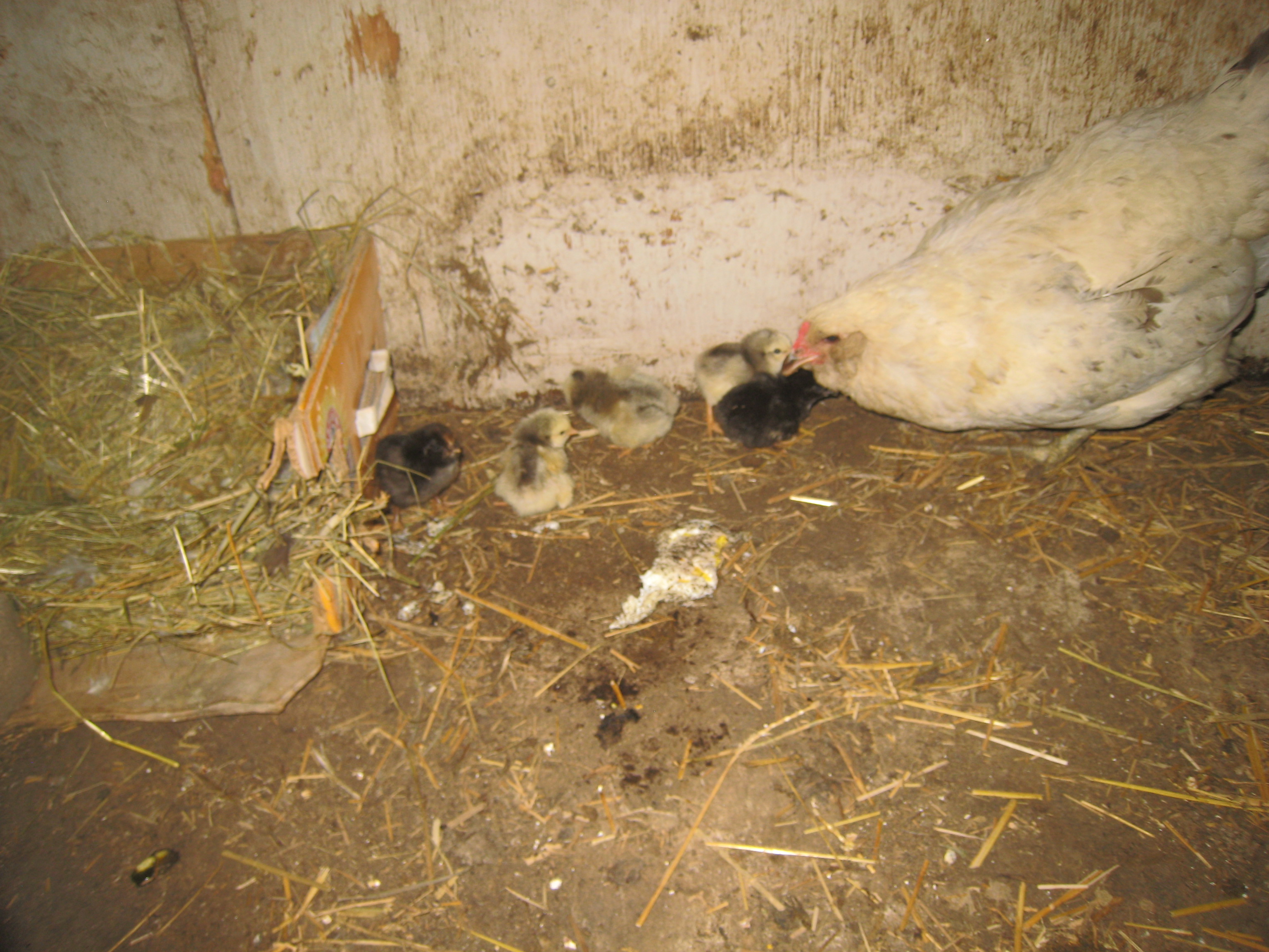 Just did chores and took some pics for your edification. Bianca and her five, enjoying a fried egg, the closest thing we have to chick starter around here.