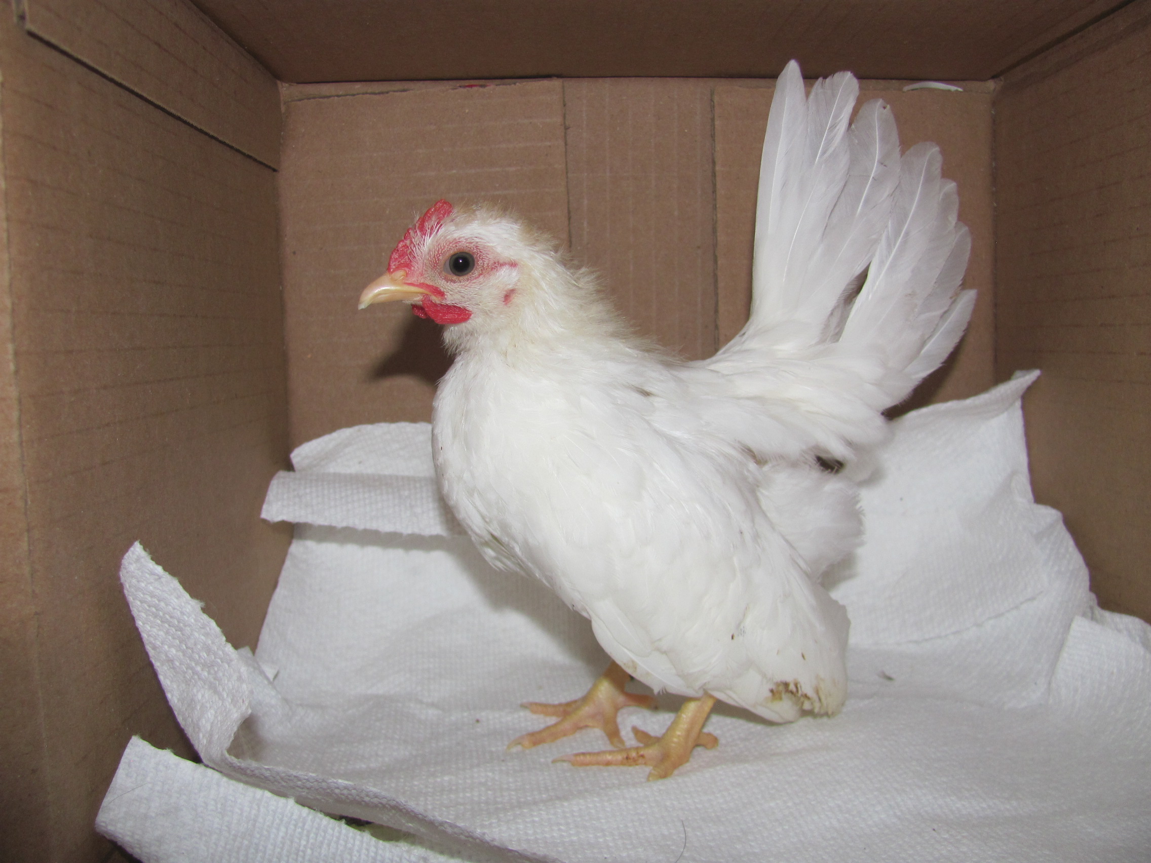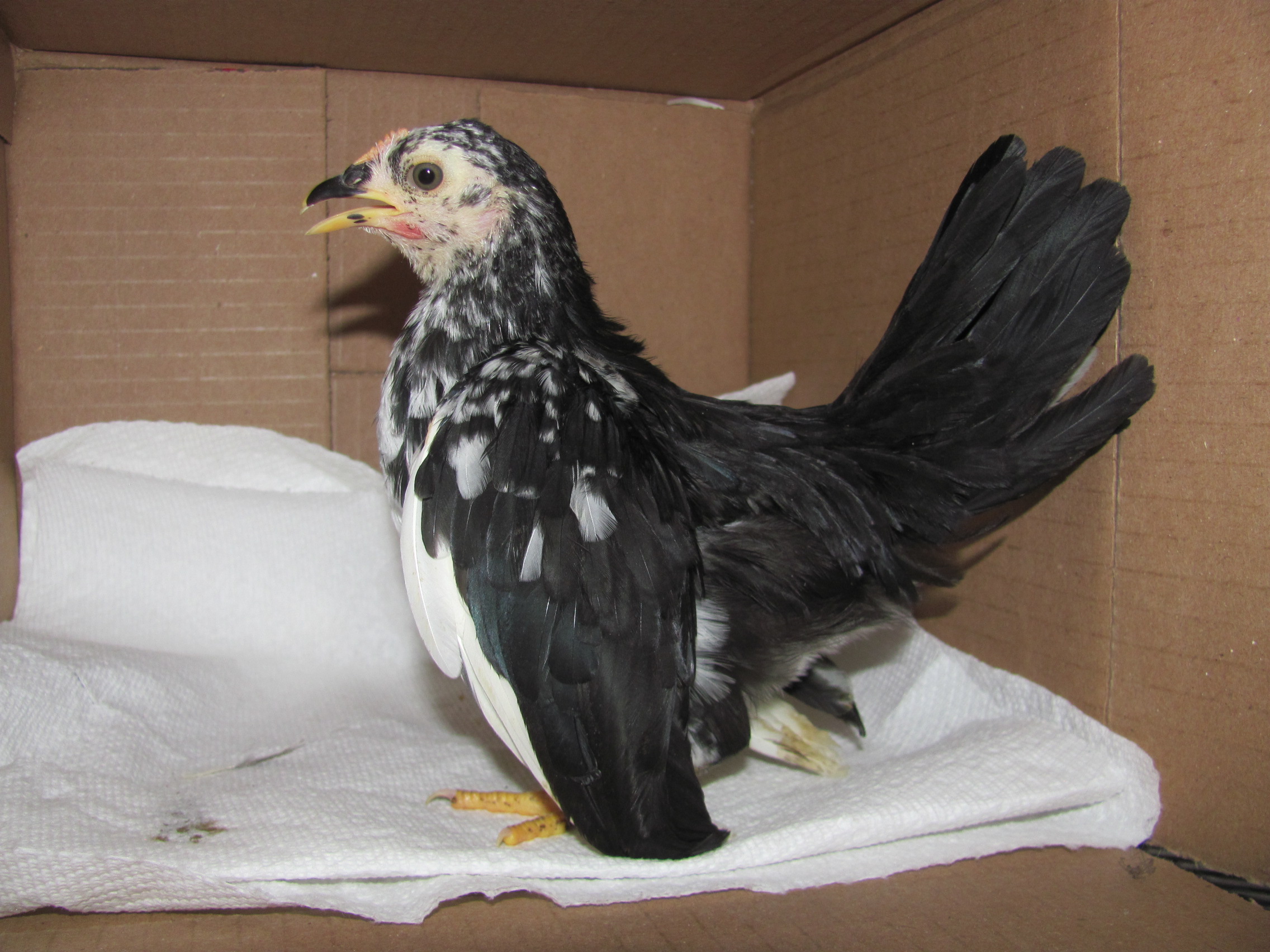 This is the biggest rooster. His tail hit the top of the box. Small black rooster with some rust coloring. Gold rooster. White and black rooster. New roosters - about 5 weeks old.