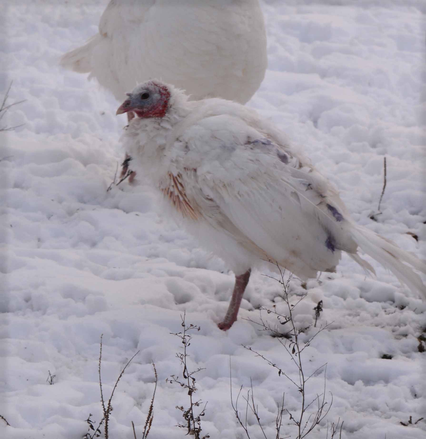 So here are some pics of one of my poor turkey girls. Only just starting to get feathers back. I don't know what is up but this year has to be the worst year for moults I've ever seen. Also very slow to get feathers back.