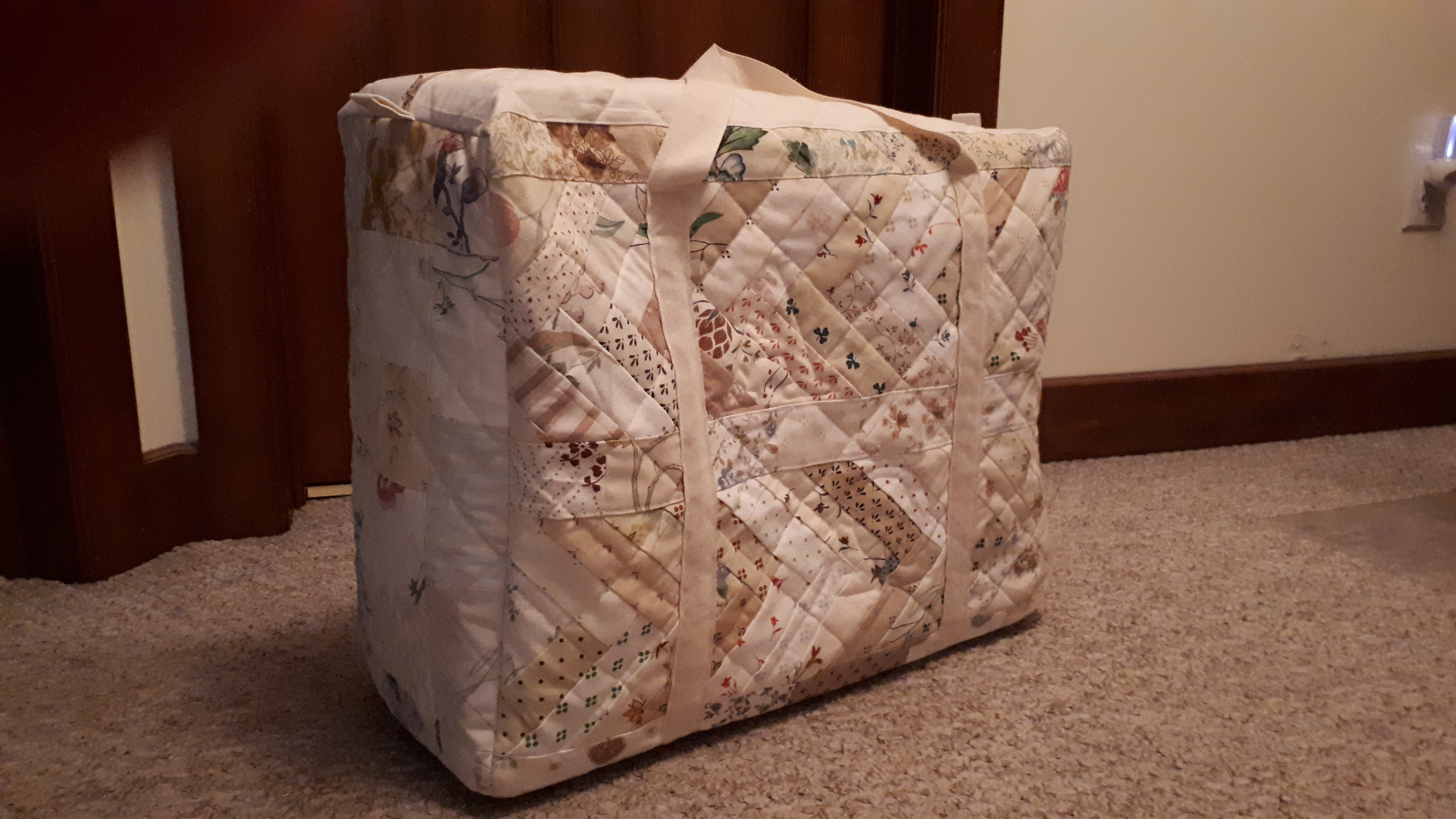 One bag is done! Boy, sewing on the side panels was not fun! Then I realized it was because of the weight of the fabric. Oh well, one more bag to finish.