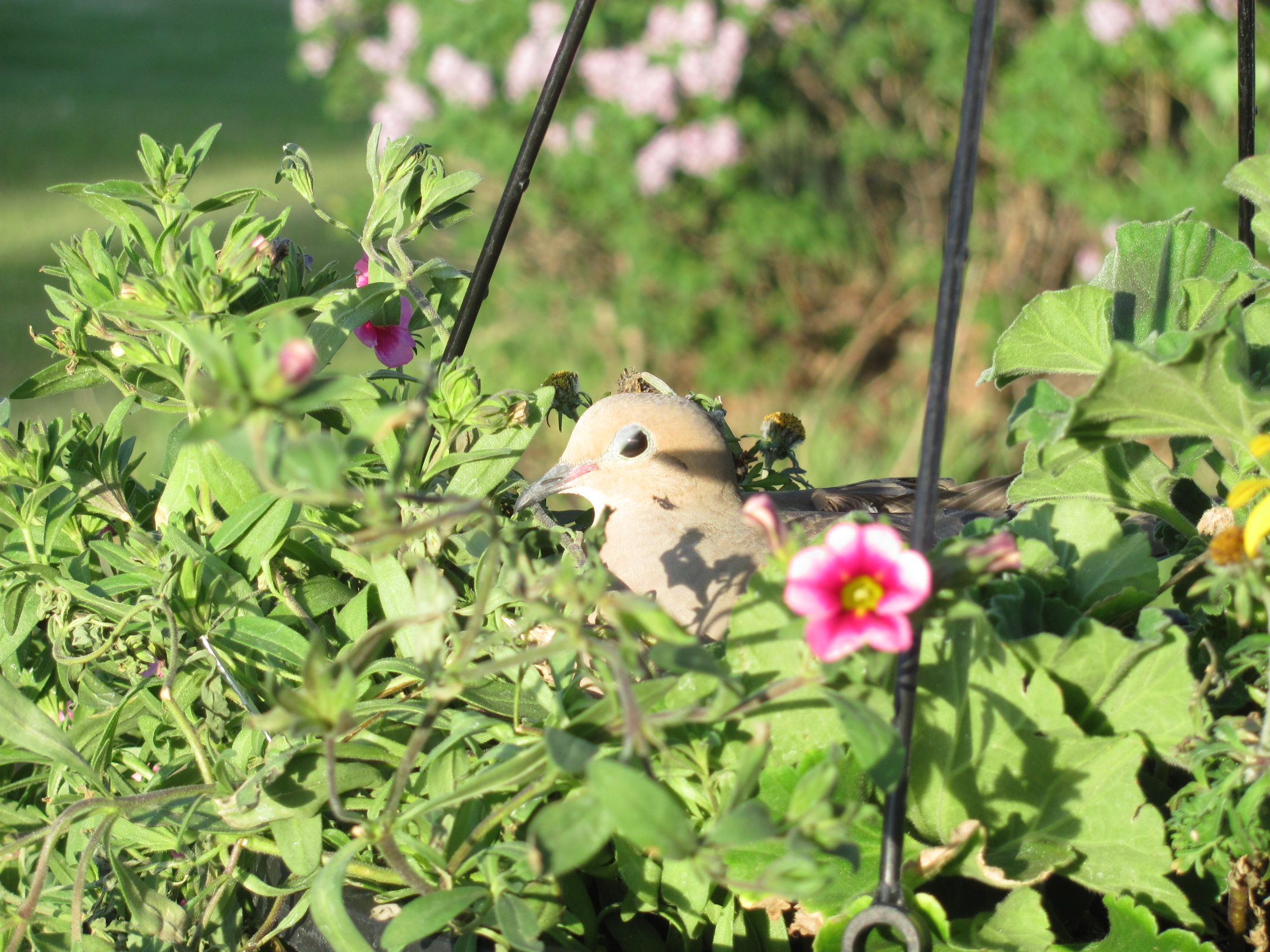 This mourning dove is nesting in a hanging flower pot at my friend`s house.