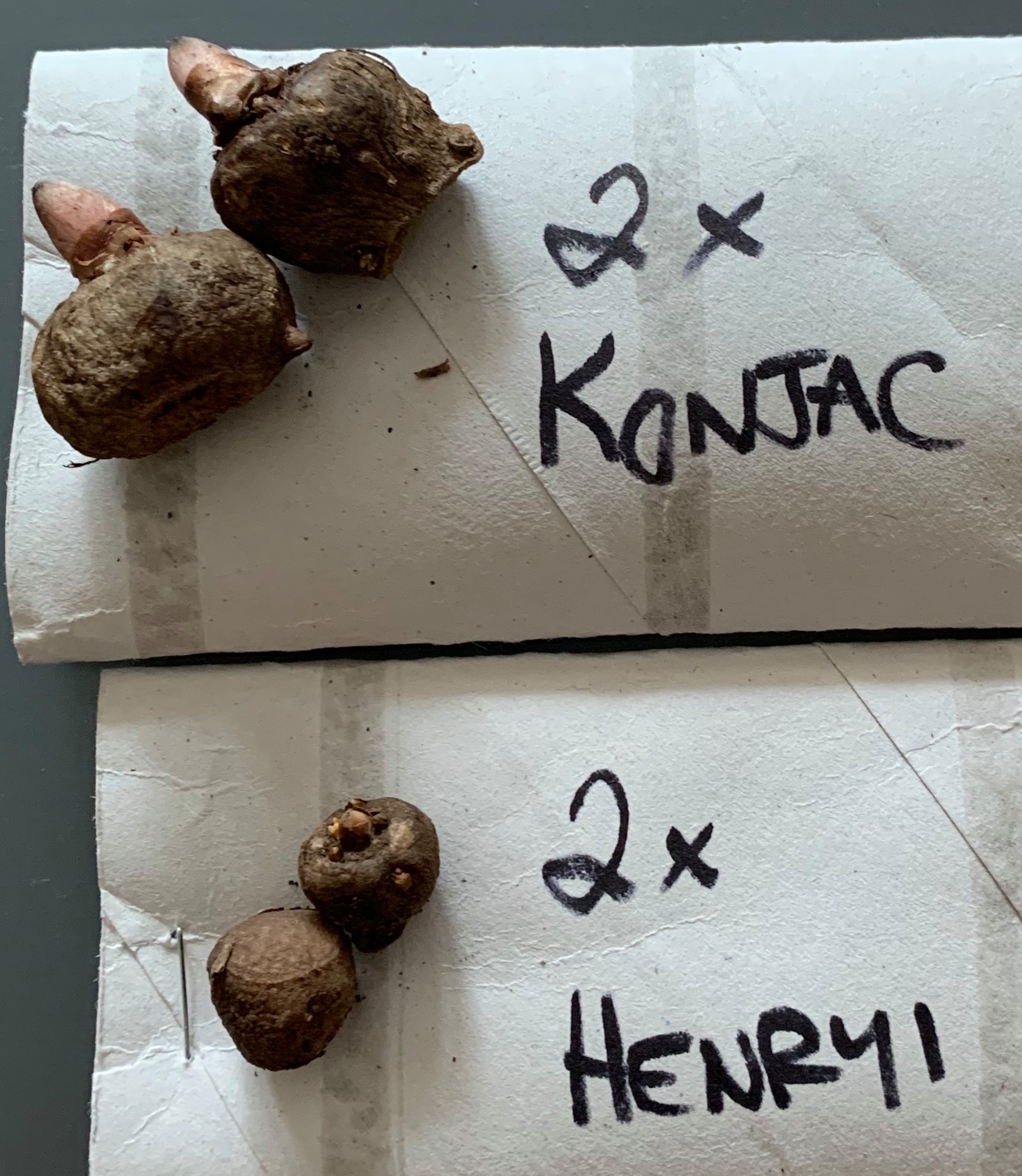 Amorphophallus konjac, the Voodoo Lily and Amorphophallus henryi, Henry's Voodoo Lily. These two plants are closely related to the Corpse Flower, Amorphophallus titanum.